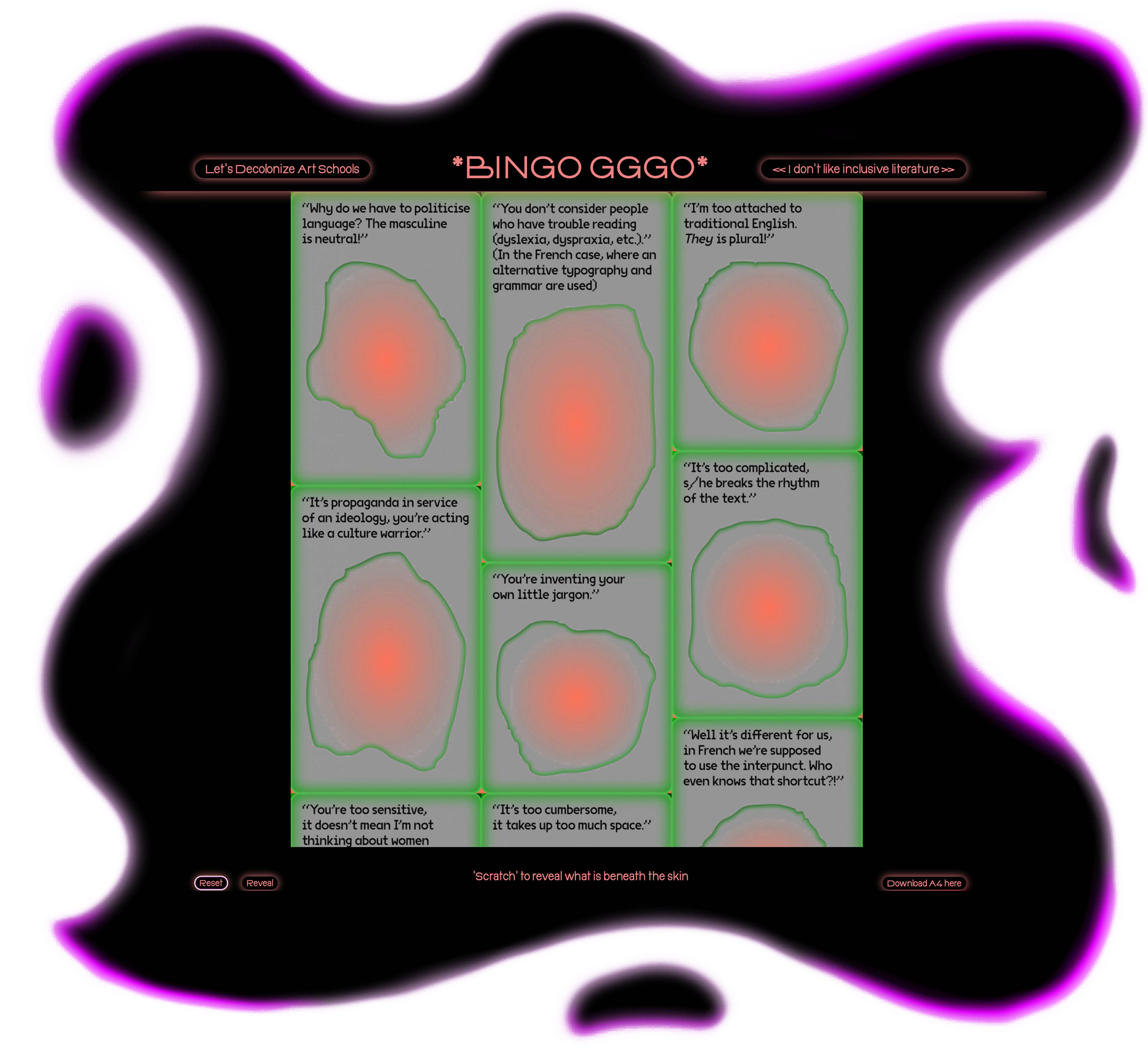 Yet another theme, to which I myself contributed, was my favorite topic about inclusive writing, with a focus on my design of the “I Don’t Like Inclusive Writing” Bingo and “Let’s Decolonize Art Schools” Bingo, which are part of the Bingo gggo group with Chloé Elvezi, Enz@ Le Garrec, ReussMaureen Leprêtre (with inputs also from Elsa Abderhamani, Nino André, Céline Chazalviel, Solène Collin, Martha Salimbeni, Chloé Stevenoot, and Daphné Targotay). The point is to use these bingos in a hostile context and to be in a position to identify systemic phrases spoken by others. Bingos thus help to highlight problematic language that is so often integrated or internalized as commonplace. These systemic attacks insidiously infiltrate language and are spread, even involuntarily, by people who have not yet undergone a process of deconstructing their privileges. These attacks take the form of repeated phrases spoken by different people. These people can often leave us voiceless. Our bingos can be a playful aid, a tool that provides both short, ironic, and incisive responses, as well as more pedagogical arguments for those who need them. These two levels of response become efficient and well-constructed counter-arguments in order to sensitize and teach others. Of course, it is still necessary to have a willing partner. These two bingos were subsequently transformed into a website featuring a playful scratch-and-reveal effect, as well as into A4 sheets made available for download, home printing, and distribution.