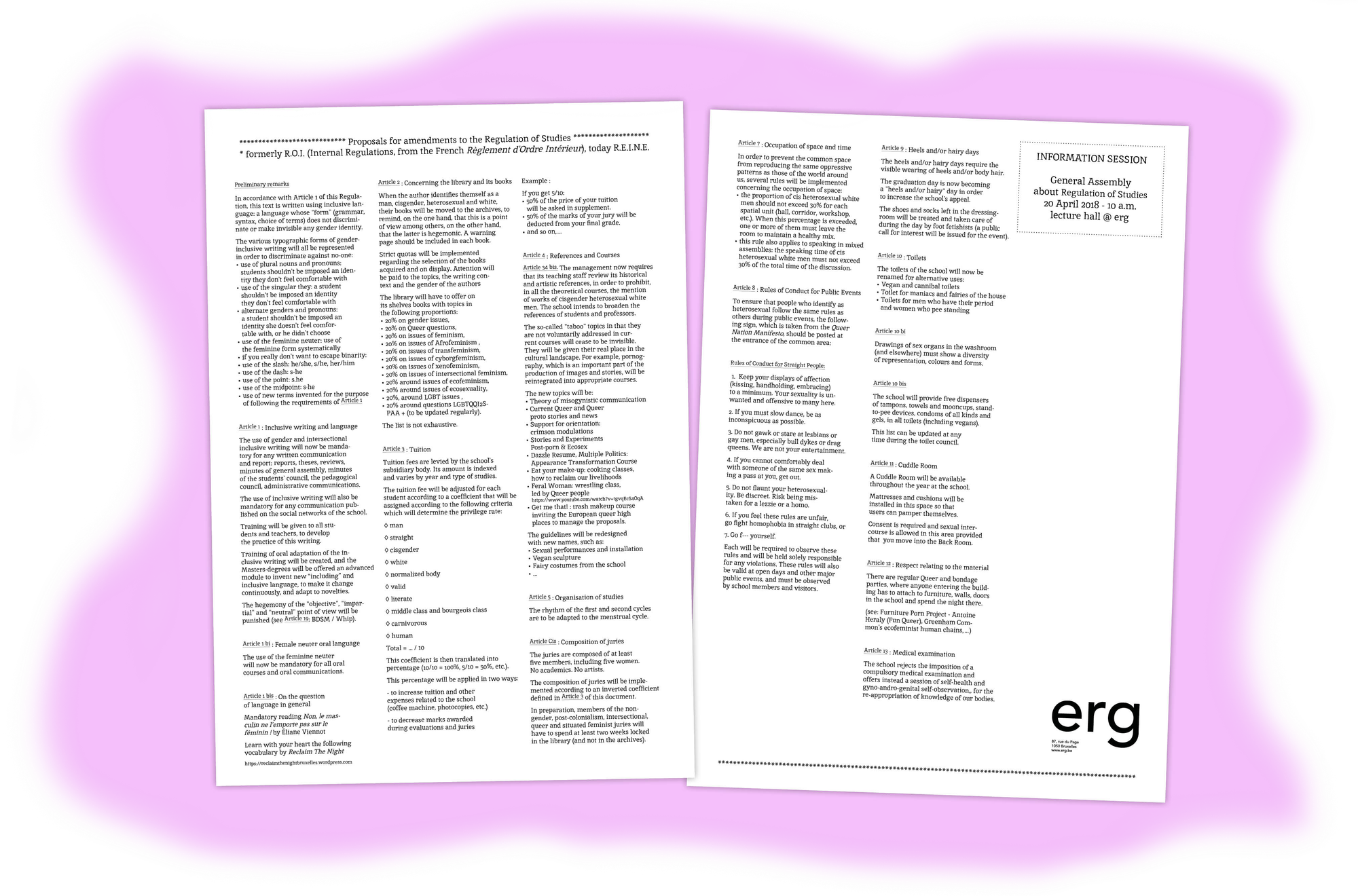 One of our first projects was a collective rewriting of ERG’s study regulations during the No Commons without Commoning symposium in 2018. There, we provided an open table where students and lecturers could exchange ideas and—with a lot of irony and humor—we imagined regulations we wanted to live by. Suggestions included mandatory inclusive writing, banning books by cis-male authors in the library, privilege-based tuition fees, a cuddle room, and the rejection of the compulsory medical examination. We also renamed the study regulations from ROI (le règlement d’ordre intérieur or R.O.I., meaning “king” in French) to R.E.I.N.E. (“queen”). [laughs]