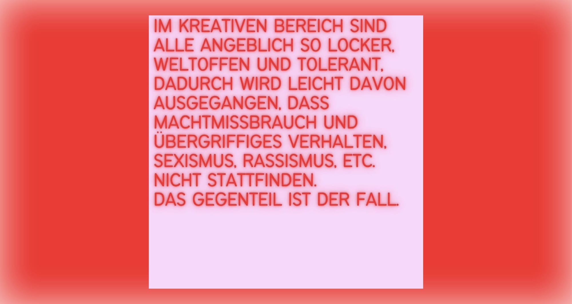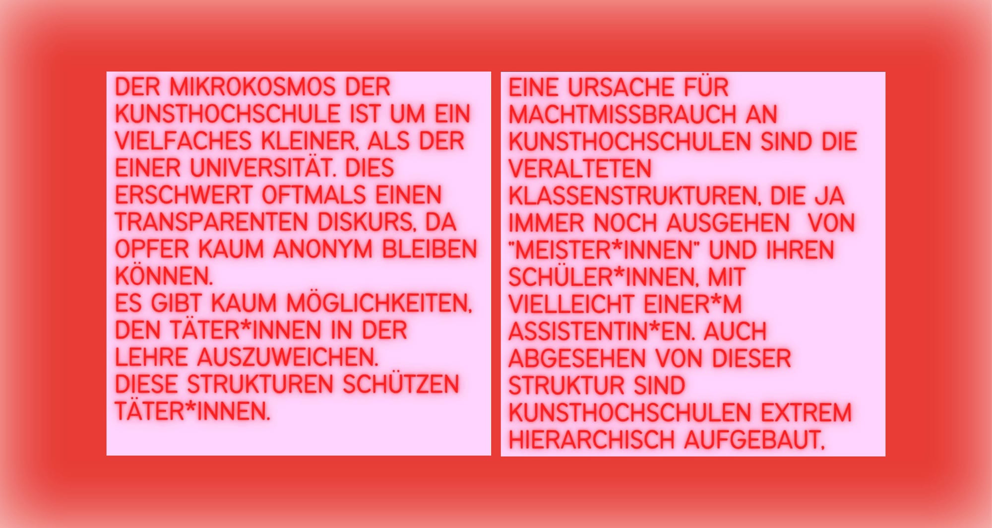 At the time of writing this text, the team of @machtmissbrauch is working on analyzing and visualizing the data of more than 300 participants. To give people a first insight into the results, @machtmissbrauch already published 35 experience reports on their Instagram account. Glowing red letters tell of the difficulty of raising critique and voicing complaints within the hierarchical structures of the institutions, of lack of solidarity among students, of discrimination, and of sexual relationships between students and teachers.